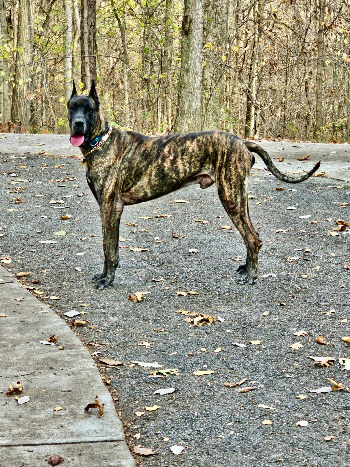 Lord Forrest was born on August 5, 2020. He is a 100% American Brindle Great Dane weighing a lean 145lbs. Forrest is a member of the American Kennel Club. He has also been genetic health tested by Embark with results proving that he is not at risk for health conditions prone to Great Danes! The young lad enjoys playing tug-of-rope, taking long walks, training and learning new commands, drinking tons of water, and receiving lots of TLC.