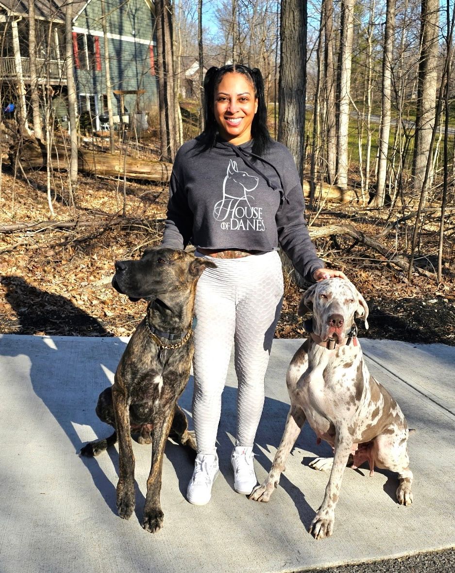 Chajuana Wise-Hale, the owner and founder of House of Danes LLC, alongside her husband and three children, own and raise three Great Danes as extended family members. Chajuana has always been passionate about dogs and the desire to nurture and train them. It was natural to her. When she was in high school, she wanted to major in veterinarian medicine. In fact, while in college she worked as a veterinarian technician which is where she gained most of her clinical, hands-on experience with animals. Chajuana graduated with a BA in Chemistry and a minor in Spanish from Purdue University and has worked in the medical field for over 16 years. Presently, she is a clinical engineer and enjoys working in local hospitals saving lives! Read More